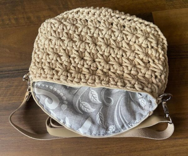 A táskán lévő crossbody-s pánt valódi bőr és karabínerrel záródik, így bármikor levehető – megkönnyítve ezzel a táska mosását.