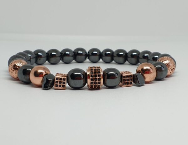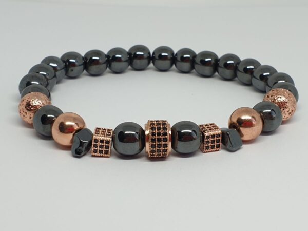 Anyaga: hematit (szürke és rose gold), cirkon Gyöngyök mérete: 8 mm, 10 mm Karkötő mérete: egyedi méret szerint (15 – 21 cm) Elkészítés ideje: 2- 5 munkanap
