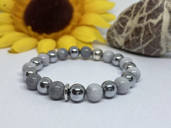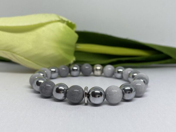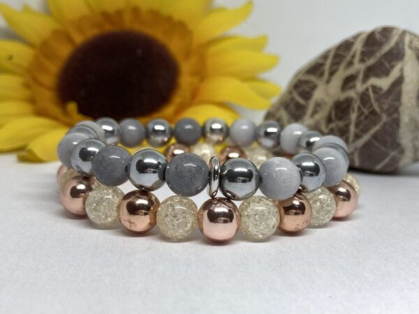 Anyaga: ezüst és rosegold színű hematit, pezsgő színű hegyikristály, szürke jade