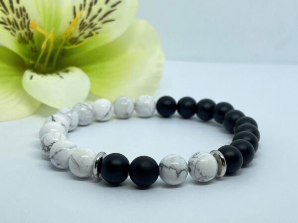Anyaga: howlit, onix Gyöngyök mérete: 8 mm Karkötő mérete: egyedi méret szerint (15 – 21 cm) Elkészítés ideje: 2- 5 munkanap