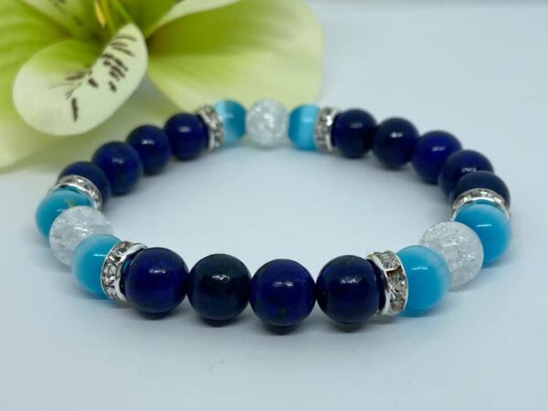 Anyaga: macskaszem, lapis lazuli, hegyikristály Gyöngyök mérete: 8 mm Karkötő mérete: egyedi méret szerint (15 – 21 cm) Elkészítés ideje: 2- 5 munkanap