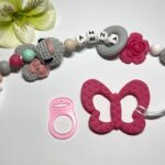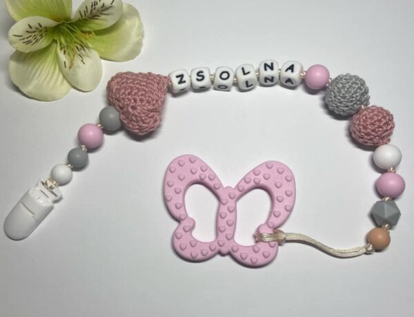 Babarózsaszín pillangós rágcsa- és cumilánc horgolt szívvel