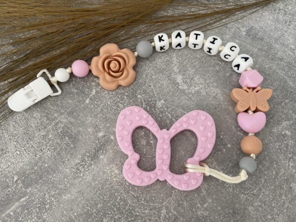 Bézs rózsás rágcsa- és cumilánc pillangóval