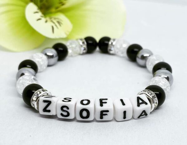 Anyaga: hematit, hegyikristály, műanyag betű kocka Gyöngyök mérete: 8 mm Karkötő mérete: egyedi méret szerint (15 – 21 cm) Elkészítés ideje: 2- 5 munkanap