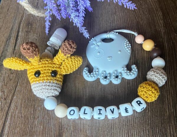 Horgolt zsiráfos rágcsa- és cumilánc