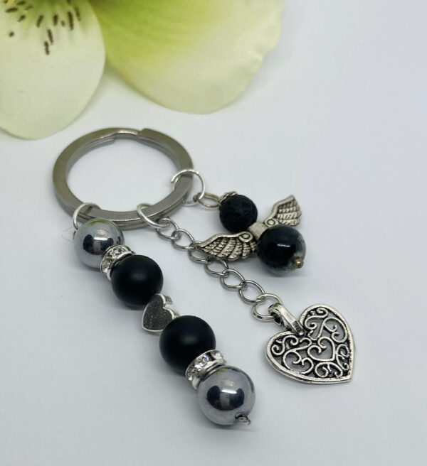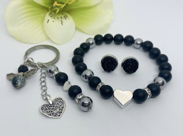 Matt onix- hematit kulcstartó és karkötő szett fülbevalóval