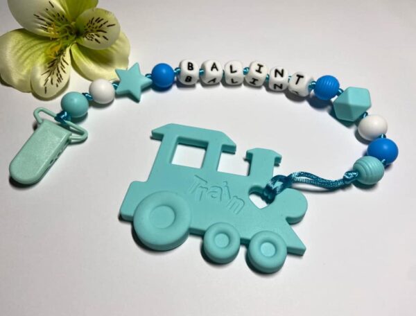 Menta- kék színű vonatos rágcsa- és cumilánc